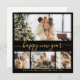 Cartão de Feriado de Colagem de Fotografias Mínima para Caligrafia Elegante, Preto e Dourado. Este modelo de cartão festivo, mimalista, de quatro (4) fotos apresenta uma bonito colagem fotográfica e diz "Feliz ano novo"! O texto de saudação é escrito em um belo tipo de letra maiúscula, escrito à mão, com letra maiúscula, em ouro sobre fundo preto. No verso, com modelo de saudação de texto, um pequeno rabisco cardíaco e um modelo de foto horizontal em branco. Um cartão de boas-vindas para a sua família e amigos na época de Férias de inverno.