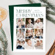 Cartões de foto de Natal moderno com "Feliz Natal" exibido no topo da design em letras verdes modernas com fundo branco. Uma colagem de fotos de 9 fotos é mostrada abaixo em um layout no estilo grade. Personalize o cartão de Natal multifoto com seu nome de família. A placa se reverte para exibir um fundo verde com sutis pontos brancos (neve).
