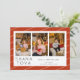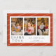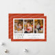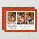 Cartão de Férias Colagem de Fotos 3 Rosh Hashanah Shana Tova é um design elegante com uma colagem de três fotos na frente, uma linha para seus desejos e um modelo para o nome da sua família e primeiros nomes. O verso é um vermelho festivo com listras diagonais