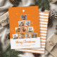 Cartão de colagem de fotos no estilo moderno e moderno Instagram, com espaço para 10 fotos da família quadrada, em forma de árvore de Natal, tocada com um coração balançoso. O verso mostra um padrão mínimo escandinavo de árvore em uma laranja retrógrada brilhante. Uma fonte manuscrita angustiada lê Feliz Natal acima do espaço para uma mensagem personalizada, nome da família e ano.