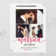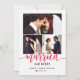 cartão com fotos de feriado "Casado e Feliz" para recém-casados apresenta uma coleção de fotos do dia do casamento, texto personalizado vermelho e preto que pode ser personalizado com nomes e data do casamento. Inclui um sotaque cardíaco vermelho. Uma foto e um obrigado adicionais que você envia aparecem na parte traseira da placa.