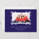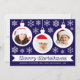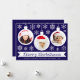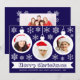 Um cartão de Natal com foto para uma família com crianças. Ele tem 3 bolas brancas de Natal com fotos redondas dentro delas: uma menina, um menino e um bebê, todos com chapéus vermelhos de Papai Noel. As bolas estão cercadas por flocos de neve brancos. A mensagem Feliz Natal está escrita em uma moldura de fita branca, com os nomes abaixo dela em letras maiúsculas. O fundo é azul escuro.