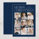 Cartões de foto de Natal moderno com "Feliz Natal" exibido no topo da design com letras brancas em tendência, com fundo de marinho. Uma colagem de fotos de 9 fotos é mostrada abaixo em um layout no estilo grade. Personalize o cartão de Natal multifoto com seu nome de família. A placa reverte para exibir um plano de fundo do marinho com pontos brancos sutis (neve).