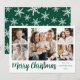 Cartão com fotos moderno de férias com 5 fotos favoritas organizadas em um layout de colagem. Sua saudação personalizada aparece em um roteiro elegante verde com seu nome de família e o ano exibido à direita. A placa se inverte para exibir um padrão verde e branco do floco de neve.