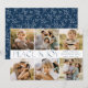 Cartão de Natal colorido e moderno, com 6 imagens de colagem das suas fotos familiares favoritas. "Paz e Alegria" é apresentado em letras alternadas de azul claro e escuro. Personalize a frente da placa adicionando um cartões de natal personalizado, o nome e o ano. A placa se reverte para exibir um padrão foliar branco de inverno com um fundo azul marinho.