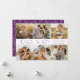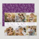 Cartão de Natal colorido e moderno, com 6 imagens de colagem das suas fotos familiares favoritas. "Paz e Joy" é exibido em letras alternadas, claras e roxas escuras. Personalize a frente da placa adicionando um cartões de natal personalizado, o nome e o ano. A carta se inverte para exibir um padrão foliar branco de inverno com um fundo roxo escuro.