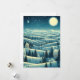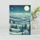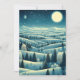 Uma paisagem de fantasia pacífica de inverno de neve cobria colinas rolantes, lua de cheio e um céu estrelado.