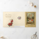 Este lindo cartão de Natal trifold apresenta uma bela impressão religiosa católica tradicional personalizada de Natal vintage da Virgem Maria, São José e anjos olhando para o Menino Jesus enquanto Ele jaz no presépio. No interior há um lindo poema sobre o Natal sobreposto a uma vela de Natal acentuada com poinsétia e rosário.