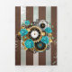 Relógio antigo e patenteado, adornado com joias, mãos de ouro e algarismos latinos com rosa de turquesa sobre fundo castanho e listrado. Estilo Steampunk.