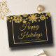 Cartões de Natal corporativos chic com Feliz Feriados escritos em um elegante roteiro cursivo de ouro sob uma bela borda de flocos de neve caídos em um cartão de feriado preto moderno. Personalize este cartão de feriado profissional com o nome da sua empresa na frente e a sua mensagem de negócio no dentro para enviar aos clientes.