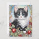 Cartão de Natal caprichoso com um gatinho tuxedo fofo cercado por framboesas. "Felizes Festas" no verso pode ser personalizado ou deixado em branco para uma mensagem manuscrita. Ótimo para amantes de gatos. Por favor, visite minha loja para mais arte de gato tuxedo!