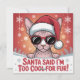 Celebrate Christmas with attitude! This fun design features a stylish Sphynx cat wearing Santa’s hat and cool sunglasses, paired with the playful quote “Santa said I’m too cool for fur!” Perfect for Sphynx lovers and cat enthusiasts who adore humor and holiday cheer. Add a unique twist to your festive season with this trendy, hairless cat Christmas artwork. Ideal for apparel, cards, and home décor.