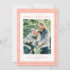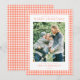 Create your own custom photo Christmas cards featuring one of your favorite family pictures alongside personalized minimalist typography name and year on a cute coral gingham plaid pattern background.