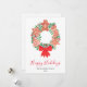 Este cartão de Natal é decorado com uma coroa de biscoitos em aquarela, folhagens festivas e frutas vermelhas.