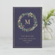 Este cartão de Natal elegante e moderno apresenta uma deslumbrante coroa de Natal com folhas verdes, frutos vermelhos e belos acentos dourados artificiais, com sua inicial ou monograma no centro. Uma moldura dourada artificial clássica decora a borda, e o fundo é azul escuro rico.