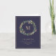 Este cartão de Natal elegante e moderno apresenta uma deslumbrante coroa de Natal com folhas verdes, bagas vermelhas e belos detalhes em dourado falso, com a sua inicial ou monograma no centro. Uma moldura clássica em dourado falso decora a borda, e o fundo é azul escuro rico.