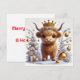 Envie alegria natalina com este cartão de Natal chato caprichoso com uma vaca das Terras Altas encantadora adornada com uma coroa dourada e rodeada por decorações festivas de Natal em dourado e branco. Perfeito para amantes de animais e aqueles que procuram um cartão de Natal único e mágico.