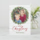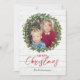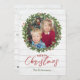 Enquadre sua foto favorita com uma adorável coroa de azevinho sobre um fundo de madeira branca. Este cartão de Natal rústico vai deliciar familiares e amigos. As placas também são mostradas na parte de trás com um espaço opcional para uma mensagem ou revisão do ano.