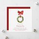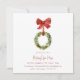 Um convite de casa aberta de Natal com coroa de Natal suspensa com laço vermelho. Este convite de festa de Natal apresenta uma coroa de Natal de folhagem com um laço vermelho. Todo o texto pode ser personalizado com qualquer redação de sua escolha.