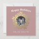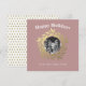 Design de feriado festivo roxo moderno com o texto 'Feliz Natal' e uma coroa dourada elegante em um fundo azul. Basta adicionar o(s) seu(s) nome(s) (da família) e sua foto. O verso do cartão tem um padrão de árvore de Natal dourado em um fundo branco. Se precisar de ajuda ou de produtos correspondentes, entre em contato conosco através da nossa loja.