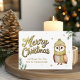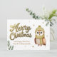 Esta adorável carta de Feliz Natal apresenta uma coruja fofa vestindo um feriado assustador ao lado do falso guião de ouro brilhante e sua mensagem personalizada por baixo. O pínus bonito sai dos cantos desta moda de desenho de animais de moda, recheada de flocos de neve brancos.