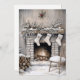 A festive stone fireplace trimmed with snowy evergreen boughs, glowing candles, and three hanging stockings sets a classic holiday scene. Firewood, snowfall, and a wooden chair complete the quiet, rustic charm. The back of the card includes the verse Wishing you peace, joy, and happiness this holiday season, with space to personalize your name or signature.