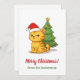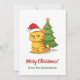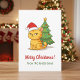 Grumpy looking orange tabby cat is wearing a red Christmas hat. Small Christmas tree behind it. Customizable text.