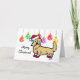 Cartão de Férias de Natal de Cream Dachshund, de cabelo longo, para os proprietários de Dachshund!! Um adorável Dachshund está sorrindo com seu Chapéu Santa! Ornamentos Coloridos ao fundo. Você pode personalizar texto e muito mais! Arte canina exclusiva e engraçada criada por Naomi Ochiai do Japão.