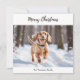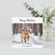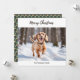 Um cartão de Natal com uma fotografia de um dachshund creme inglês que corre pela floresta de inverno em neve.