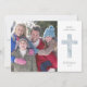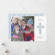Este cartão de Natal moderno apresenta uma bela cruz em aquarela e uma grande foto. Personalize o texto acima da cruz (mostrado como "Feliz Natal") e adicione seus nomes e ano abaixo da cruz. Em seguida, escolha sua foto favorita para adicionar ao lado esquerdo do desenho da cruz. O fundo branco na frente e o fundo azul claro no verso podem ser alterados se desejado.