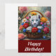 Ilustração de um filhote de leopardo branco num cesto de flores apresentado num cartão de saudação plano de 5 x 7 polegadas