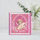 Uma ilustração vintage com um cupido em um selo postal rosa que diz "Cumprimentos de Loveland para Você". Detalhe do coração na parte inferior.