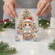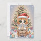 The background sets a magical scene with a sparkling Christmas tree, soft falling snow, and elegant pastel roses in blue and pink. This card is perfect for cat moms, kids, or anyone who loves cute animals.