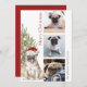 This cute Pug themed Christmas card features a pug wearing a Santa hat sitting in front of a lit Christmas tree. The greeting on the card reads "Merry Christmas" and can be personalized. Further personalize this holiday card with three photos of your pet dog, a signature and the year.