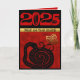 Em um quadrado há um recorte de papel de uma cobra preta, colocado no centro olhando para um ornamento dourado dentro do qual está a segunda cobra com ideograma. Atrás da cena há um fundo vermelho no qual letras decorativas e ornamentadas formam as palavras: ANO DA COBRA. Desenho em cartão de felicitações vertical padrão com grande 2025 vermelho personalizável em fundo preto. Você pode facilmente alterar o número (fonte, cor, tamanho e posição) clicando no botão personalizar. Cartão postal de férias correspondente e mais... Perfeito para o Ano Novo Chinês da Cobra 2025 ou aniversário (pessoas nascidas no Ano da Cobra). --------- "A cobra (蛇) é a sexta do ciclo de doze anos de animais que aparecem no zodíaco chinês relacionado ao calendário chinês.