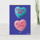 A cute dog Valentine's Day card featuring a Dachshund playing guitar surrounded by candy hearts.