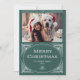 Estes Cartões de foto de Natal elegantes apresentam uma rotação moderna no deco clássico de arte. Uma imagem geométrica branca e ornamentado decorada e ornamentada decoram um fundo verde com sua foto pessoal favorita para um espetáculo de natal ao estilo Vintage 1920. A tipografia clássica diz "Feliz Natal". Há espaço para sua mensagem pessoal nas costas.