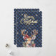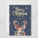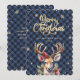 Blue calligraphy Christmas card featuring a watercolor painting of a deer, holly, red berries and other winter botanicals on a blue buffalo plaid background adorned by snowflakes.