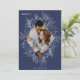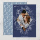 Um cartão de férias moderno e elegante que enquadra sua foto vertical ou orientada a retratos em um quadro brilhante detalhado em forma de diamante com folhas ocas, bagas e folhas de inverno em um rico fundo azul. "FELIZ" aparece no canto superior esquerdo, com o nome da sua família na parte inferior. O ano é escondido elegantemente na finamente detalhada estrutura botânica branca. Uma natureza delicada e refinada inspirou a escolha para os seus cartões de Natal de 2021.