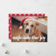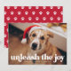Cartão de Natal temático de cachorro fofo com a foto horizontal do seu cachorro e "desperte a alegria" exibido em letras brancas em negrito. Personalize o cartão de Natal do cachorro adicionando uma saudação personalizada e seu nome. O cartão reverte para exibir um padrão de pegadas vermelhas e brancas.