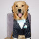 Este cartão de Dia do Pai apresenta um recuperador de ouro num terno riscado de pinos azuis com uma gravata arco de pino azul sentada numa cadeira. O texto externo diz, "Você é tão bem adequado para o papel do pai" e o texto dentro diz, "Desejando-lhe um Dia dos Pais incrível!".