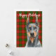 Cartão de Natal com ilustração em aquarela de Doberman Pinscher em um fundo xadrez verde e vermelho festivo e saudação de Natal personalizável.