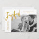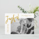 Envie alegria aos amigos e à família com um cartão de férias simplesmente alegre de Late Bloom Paperie! O cartão de feriado moderno apresenta "Joyful" em um roteiro de pincel com letra dourada. Personalize a frente do cartão adicionando sua foto, saudação personalizada, nome da família e o ano. A placa reverte para exibir um padrão de faixa diagonal em ouro e branco.