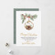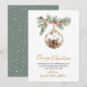 Elegante Moderno Botânico Feliz Natal Dourado Script Não Fotográfico Cartões de natal. Estes cartões de Natal festivos apresentam uma design de aquarela impressionante com ramos botânicos de pinheiro com bagas acentuadas por delicada ornamentação de vidro de ouro. A saudação do "Feliz Natal" é elegantemente escrita à mão na caligrafia dourada, criando um sofisticado contraste em relação ao fundo branco limpo. O verso complementa o design com um padrão sutil de floco de neve dourado num pano de fundo verde macio e empoeirado, adicionando um toque de charme de férias. Perfeito para a personalização, esses cartões de natal personalizados são uma maneira na moda e sincera de compartilhar seus desejos de Natal com entes queridos nesta temporada.