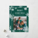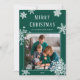 This timeless elegant Merry Christmas holiday card features white snowflakes on a rich jewel-toned deep emerald green background, with a family photo and classic text.