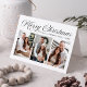 Cartão de férias moderno com "Feliz Natal" num elegante roteiro de caligrafia preto com fundo branco. A frente da placa apresenta 3 das suas fotos verticais favoritas. Personalize o cartão de feriado multifoto adicionando seu nome de família e o ano. Adicione sua mensagem personalizada ao dentro da placa ou deixe-a vazio para escrever sua própria mensagem. A parte traseira da placa apresenta um padrão de neve preto e branco.