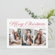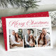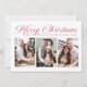 Cartão de férias moderno com "Feliz Natal" num elegante roteiro de caligrafia vermelho com fundo branco. A placa apresenta 3 das suas fotos verticais favoritas. Personalize o cartão de feriado multifoto adicionando seu nome de família e o ano. A placa se reverte para exibir um padrão de neve vermelho e branco.