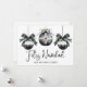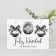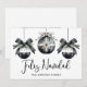 Envie votos calorosos de férias com este cartão de Natal elegante e plano, apresentando um design minimalista na frente com três enfeites em aquarela preta e branca, acentuados por folhagens verdes e detalhes de laço doce. "Feliz Navidad" é escrito em tipografia cursiva graciosa, com o nome da sua família exibido abaixo em uma fonte serifada clássica para um toque personalizado. Você também pode alterar a saudação para combinar com o seu estilo.