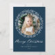 Cartão de feriado elegante com sua foto cercada por uma coroa de flocos de neve e galhos de pinheiro branco em um fundo festivo de marinho. O "Feliz Natal" é apresentado num roteiro de caligrafia branco ousado com o seu nome e o ano apresentado abaixo. A parte de trás do cartão de feriado moderno apresenta um lindo padrão de flocos de neve.