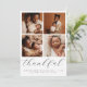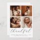 Este simples modelo de cartões de agradecimentos de quatro fotos da faculdade é perfeito para apresentar seu bebê no feriado de Ação de Graças! Ele apresenta um visual elegante, preto e branco, nítido, quatro de suas fotos favoritas de bebês, um cabeçalho de "agradecimento" em uma caligrafia elegante, e o nome e as estatísticas de seu bebê em uma fonte clássica. O reverso apresenta o seu obrigado personalizado que você envia e um pequeno coração. Use as ferramentas intuitivas de design, suas fotos favoritas e sua inspiração, e faça deste obrigado de presente de chá de fraldas de colagem multifoto minimalista você / Cartão de anúncio de natal de Ação de Graças exclusivamente seu!